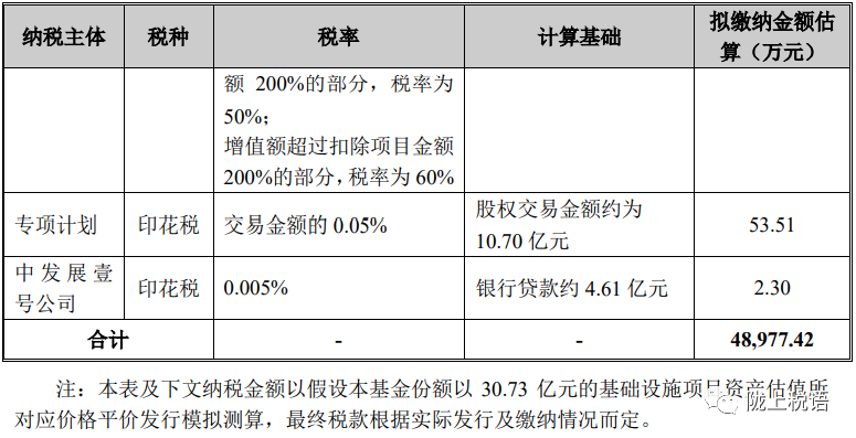 根据上海毕马威税务师事务所有限公司(简称“毕马威”)出具的《关于中发展集团公开募集基础设施证券投资基金(“REITs”)的中国税务意见书》,本项目涉及的税种包括印花税、土地增值税、企业所得税、契税、增值税及附加。根据与北京市及海淀区主管税务机关的沟通,拟采取的纳税方案中涉及的所有税种、税额估算及测算过程如下: