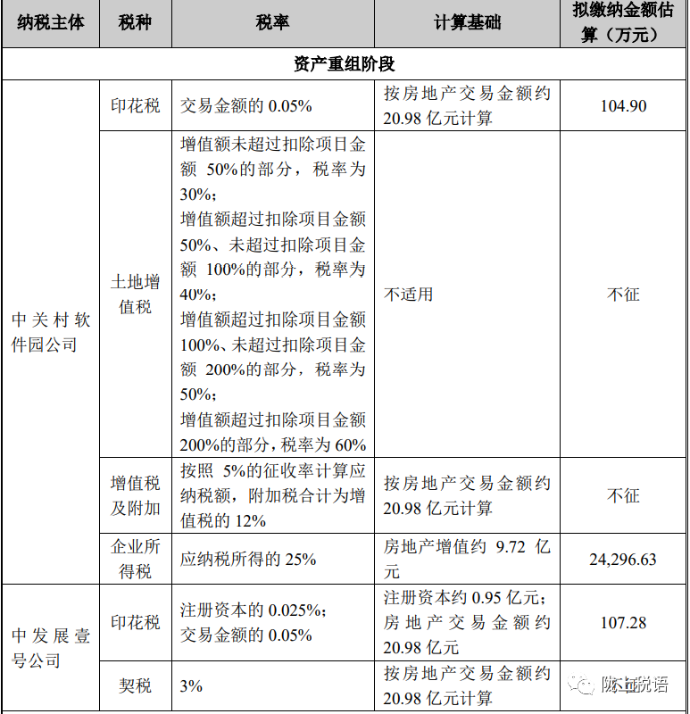 因此,中关村软件园公司应按此规定计算不动产的转让所得,计入当期应纳税所得额,并按规定缴纳企业所得税。按照20.98 亿元作为不动产评估值模拟测算,中关村软件园公司预计缴纳的企业所得税约为24,296.63 万元。