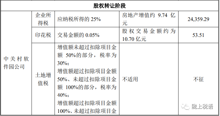中关村软件园公司应将股权转让收入扣除为取得该股权所发生的成本及转让过程中缴纳的相关交易费用及税费后的余额计入应纳税所得额,按规定缴纳企业所得税预计约24,359.29 万元。