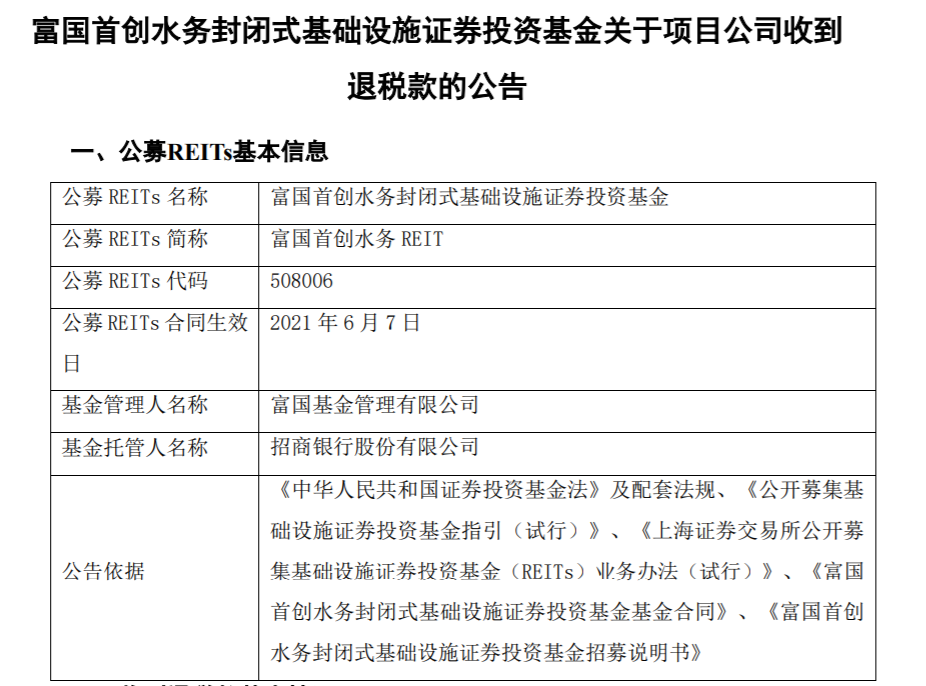 富国首创水务封闭式基础设施证券投资基金(以下简称“本基金”)旗下基础设施项目合肥十五里河首创水务有限责任公司(以下简称“项目公司”)依据财政部、税务总局《关于进一步加大增值税期末留抵退税政策实施力度的公告》(财政部税务总局公告2022年第14号)的相关要求,向主管税务机关提出增值税退税申请,经税务机关审核,准予退还增值税留抵税额人民币 40,610,688.91元。合肥十五里河首创水务有限责任公司银行账户已收到该笔退税款。