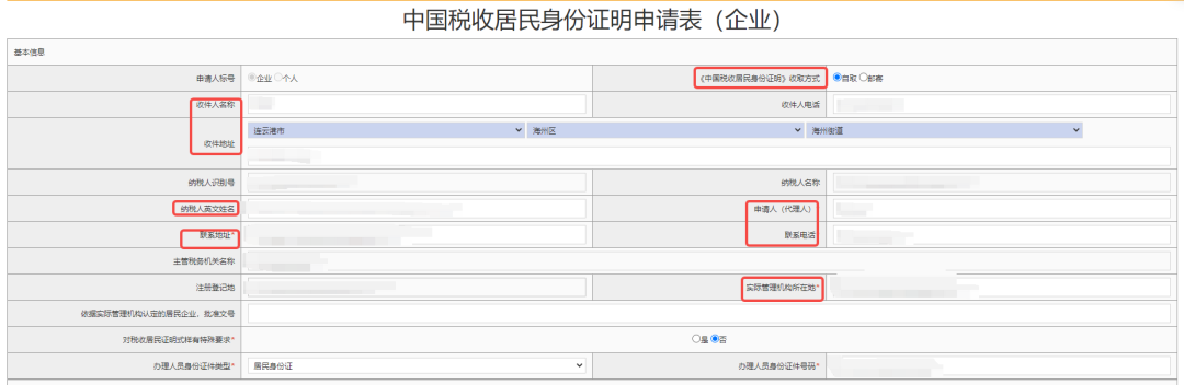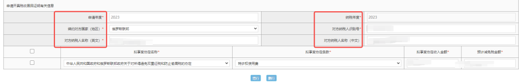 点击中国税收居民身份证明,打开申请页面。根据合同双方实际情况,录入带有标红以及带“*”的信息。