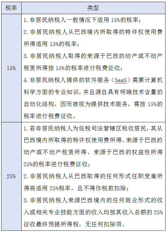 巴西境内的个人若不满足居民纳税人定义,则作为非居民纳税人。此外,当巴西税收居民离境时且提交离境个人所得税申报表则即时被视为非居民纳税人;若其未在离境时进行离境个人所得税申报,则将在离境12个月后被认定为非居民纳税。