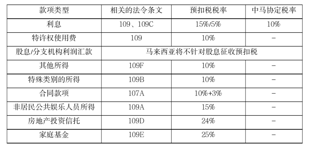 非居民企业公司所得税的缴纳实行预提税制度,预提税税率为10%至25%。非居民企业公司所得税的征税范围包括利息、特许权使用费、技术服务费等,但不包括股息(马来西亚不对股息征收预提所得税)。